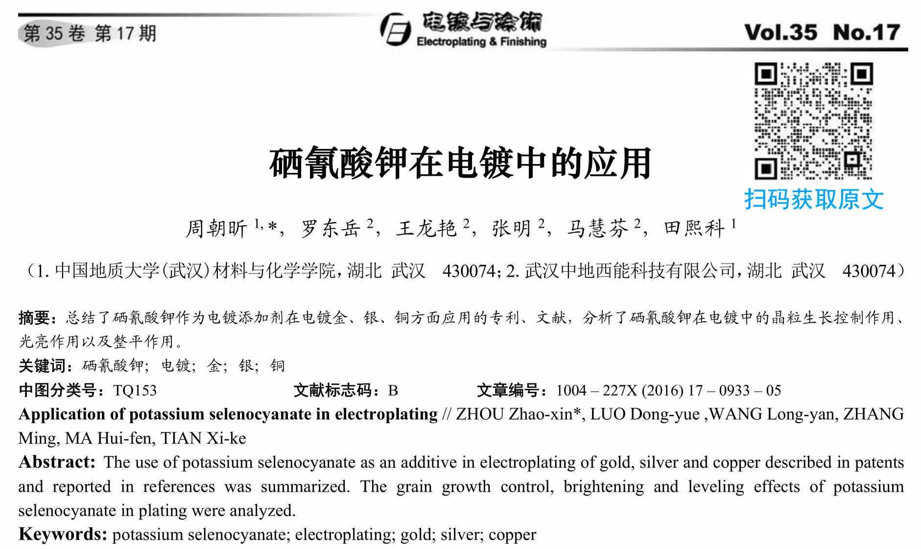 (Se)是一種重要的氧族元素。硒及其化合物在各種電化學研究中均有廣泛應用,范圍涉及到非真空法制備太陽能電池、直接甲醇/聚合物電解質膜燃料電池、電催化劑、電池、金屬合金等 [1] 。硒化合物與相應的硫化合物相比,還原電位更正 [2] 。硒氰基化合物作為電鍍添加劑,可以在金屬與氰根或其他配體形成的配離子放電的同時被還原,因此能使金、銀、銅等金屬及其合金鍍層光亮、整平,穩定鍍液,提高電流效率,尤其是在控制鍍層晶粒沉積的晶面取向方面有著特殊的用途,但國內難以找到硒氰基化合物在電鍍領域應用的介紹。