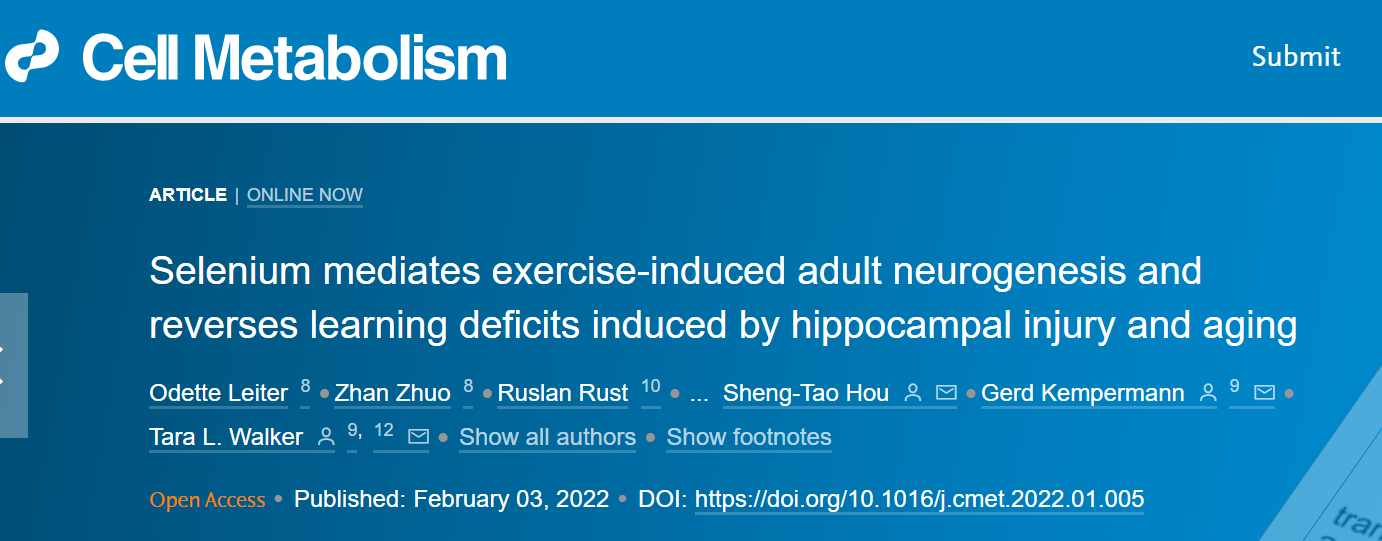 硒作為一種必不可少的營養微量元素,也是我們飲食的重要組成部分。近期,昆士蘭大學發表了研究,發現硒可以逆轉中風對認知的影響,并提高衰老大腦的學習和記憶能力。相關研究發表在《Cell Metabolism》上,題為“Selenium mediates exercise-induced adult neurogenesis and reverses learning deficits induced by hippocampal injury and aging”。