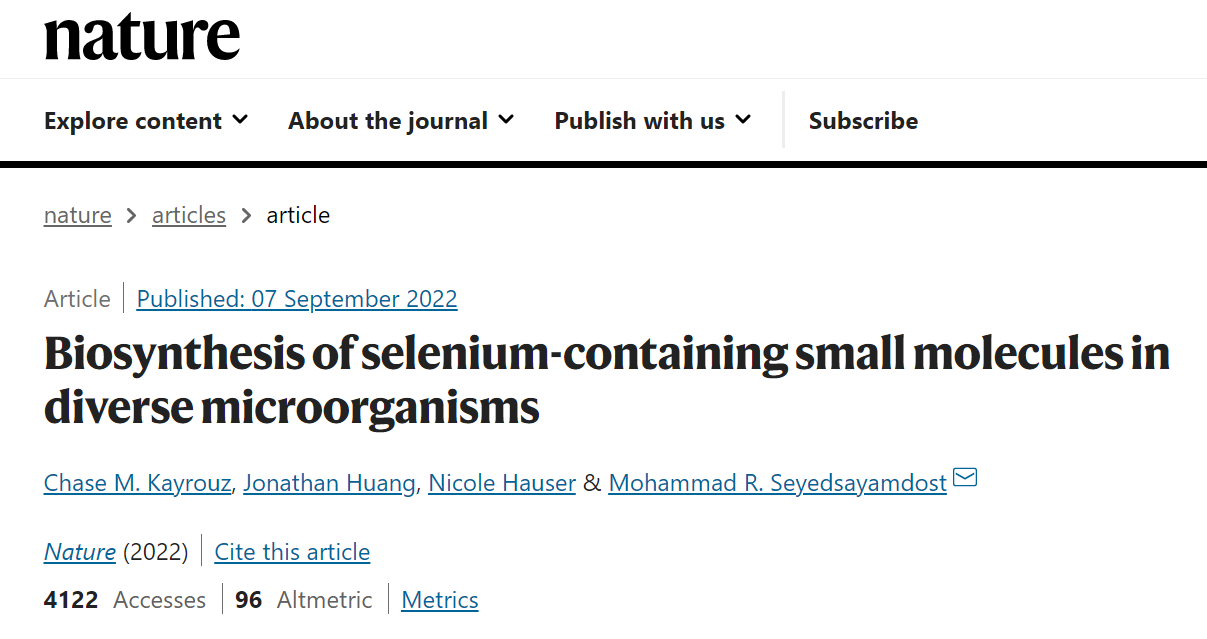 在一項新的研究中,來自美國普林斯頓大學的研究人員發現了將硒整合到微生物小分子中的生物合成途徑,這標志著率先在天然產物中發現了這種原子,為硒生物學開辟了一條新途徑。這一發現也有力地表明,硒是所有生命王國的重要微量元素,它在細菌中的生物功能可能比科學家初假設的更重要。相關研究成果于2022年9月7日在線發表在《自然》雜志上,題目為“微生物中含硒小分子的生物合成”。這篇論文的作者是普林斯頓大學化學教授Mohammad Seyedsayamdost博士。